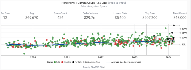 A widget displays 5 years of sales history for a specific vehicle market, including sold prices, asking prices, high bids, and a moving average trendline. The chart also shows summary statistics at a glance: number of cars currently for sale, average sale price, total sales count, dollar volume, lowest sale, top sale, and most recent sale.